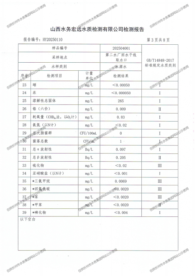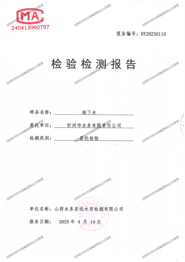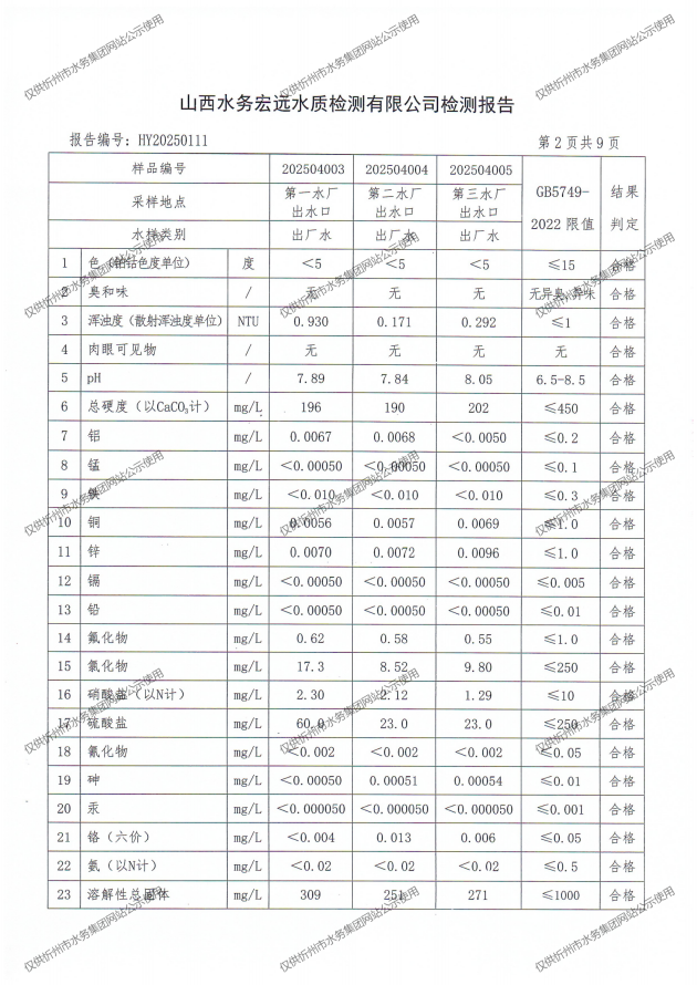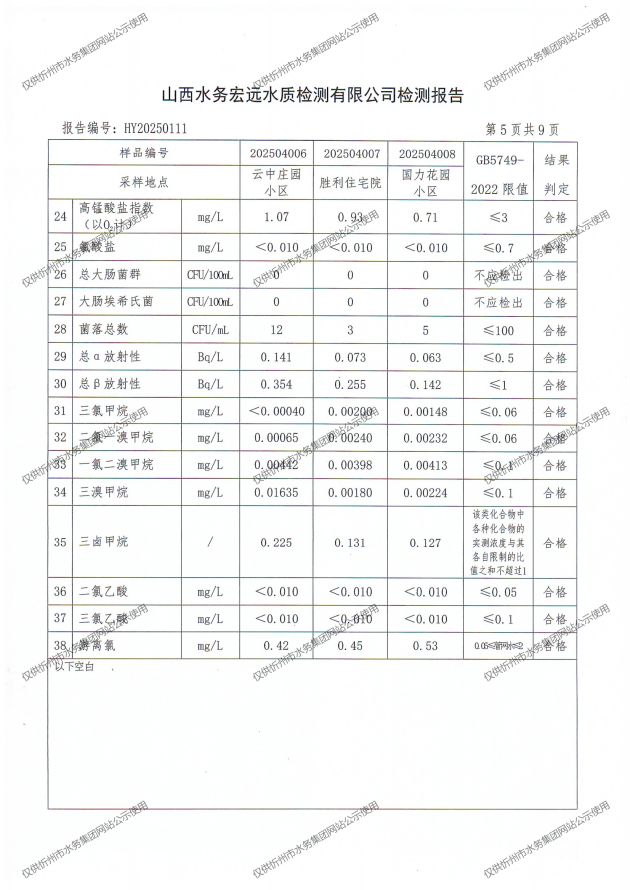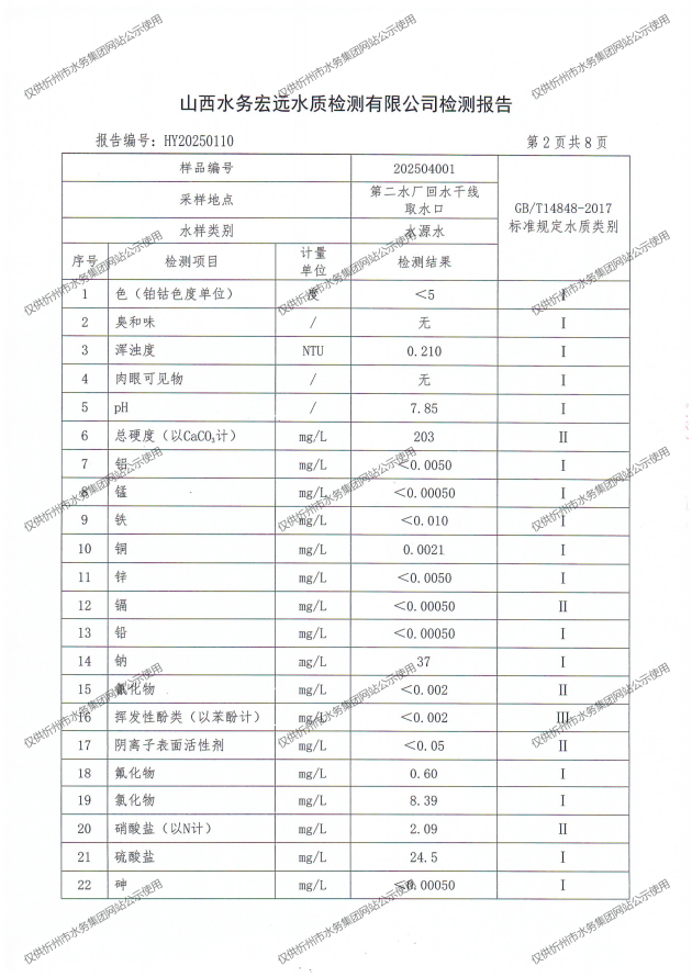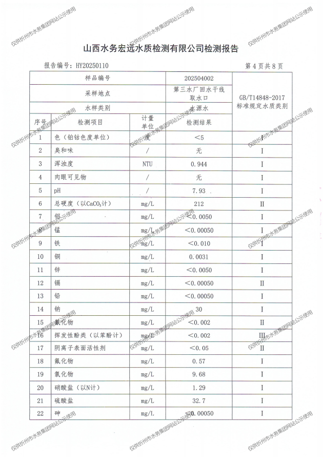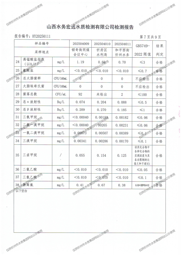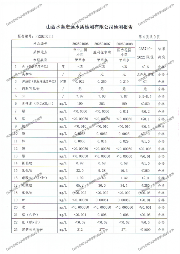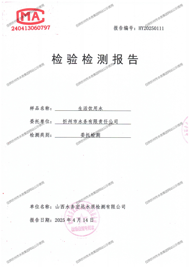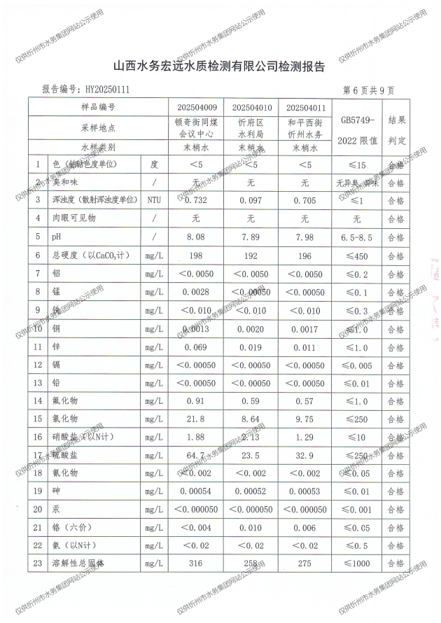 忻州城區(qū)公共供水水源水、出廠水、管網(wǎng)水、管網(wǎng)末梢水2025年4月份水質信息公示