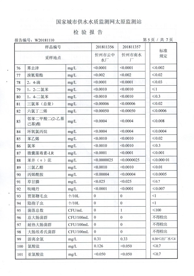 2018年忻州城區(qū)公共供水南水廠、云中水廠出廠水106項水質(zhì)全分析信息公示