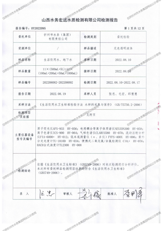 忻州城區(qū)公共供水水源水、出廠水、管網水、管網末梢水2022年8月份水質信息公示